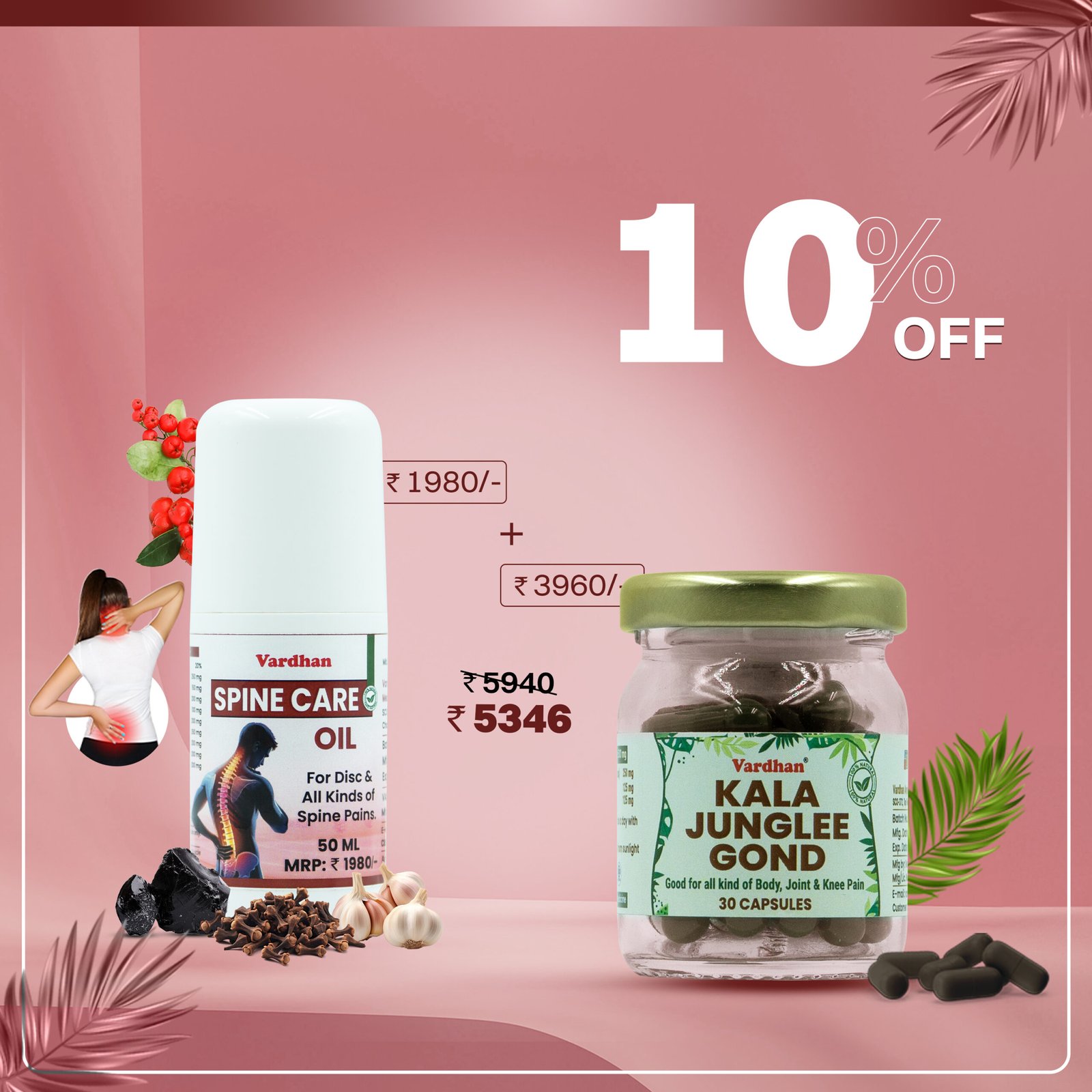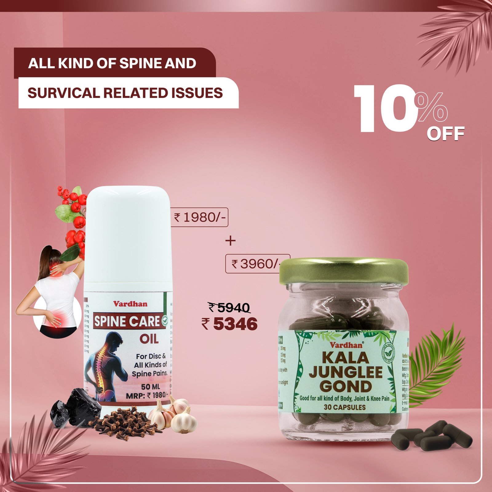 Feel Better with Our Combo Pack! Get relief from back pain and boost your overall well-being with our Spine Care Oil and Kala Junglee Gond Capsules. Perfect for improving your spinal health and feeling more relaxed and energized.