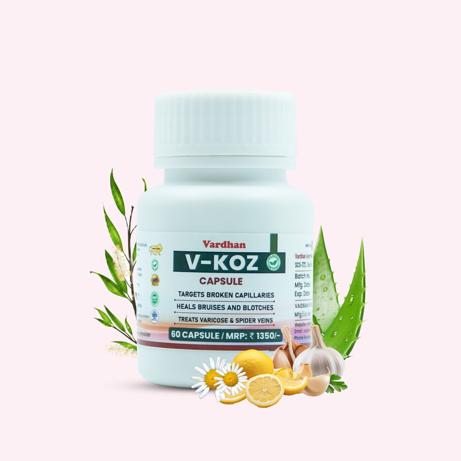 V-Koz is a herbal supplement that supports healthy circulation and skin by addressing issues like broken capillaries, bruises, and varicose veins.