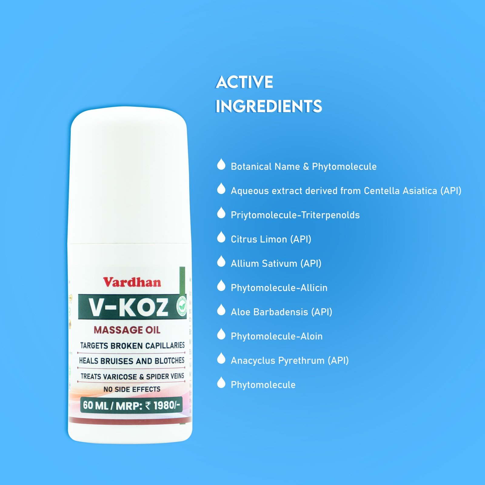 V-Koz Massage Oil combines the healing power of nature with the soothing properties of essential oils. The aqueous extracts from Centella Asiatica, Citrus Limon, and Aloe Barbadensis provide a rich source of phytomolecules like Triterpenoids, Diosmin, and Aloin, known for their skin-rejuvenating properties. Anacyclus Pyrethrum and Hesperidin Allium Sativum add further therapeutic benefits with Aescine and Allicin, enhancing blood circulation and reducing inflammation. The base oils, Vitis vinifera and Triticum aestivum, enriched with Resveratrol and Tocopherol, deeply moisturize and protect the skin. The essential oil complex of Lavender and Rosemary not only imparts a pleasant fragrance but also adds the calming effects of Linalool and Rosmarinic acid. This massage oil is an excellent choice for those seeking a natural and effective solution for skin care and relaxation.